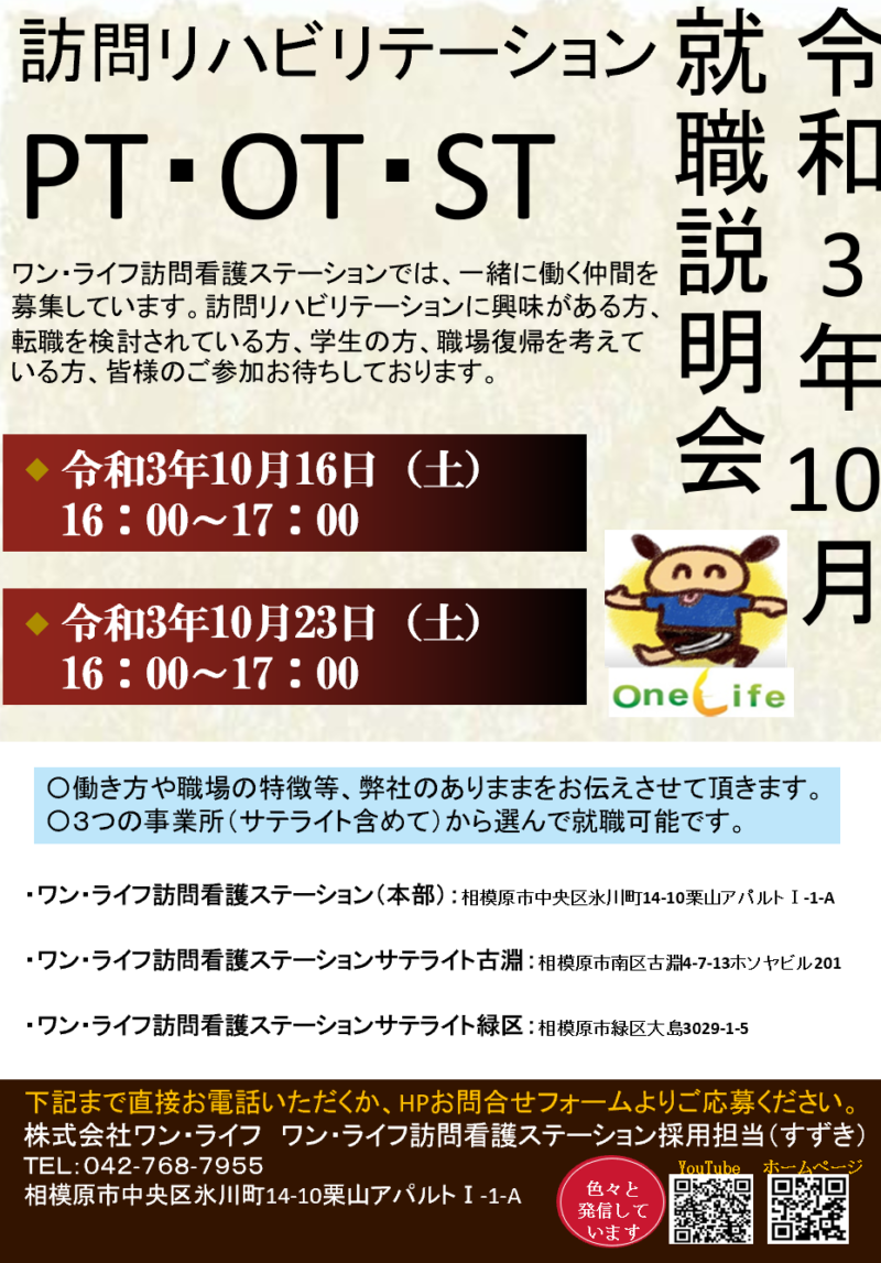 この度ワン・ライフ訪問看護ステーションでは、リハビリテーション専門職(PT・OT・ST)限定に就職説明会を開催させて頂く事になりました。訪問リハビリテーションに興味がある方、転職を検討されている方、学生の方、職場復帰を考えている方等、皆様のご参加お待ちしております。